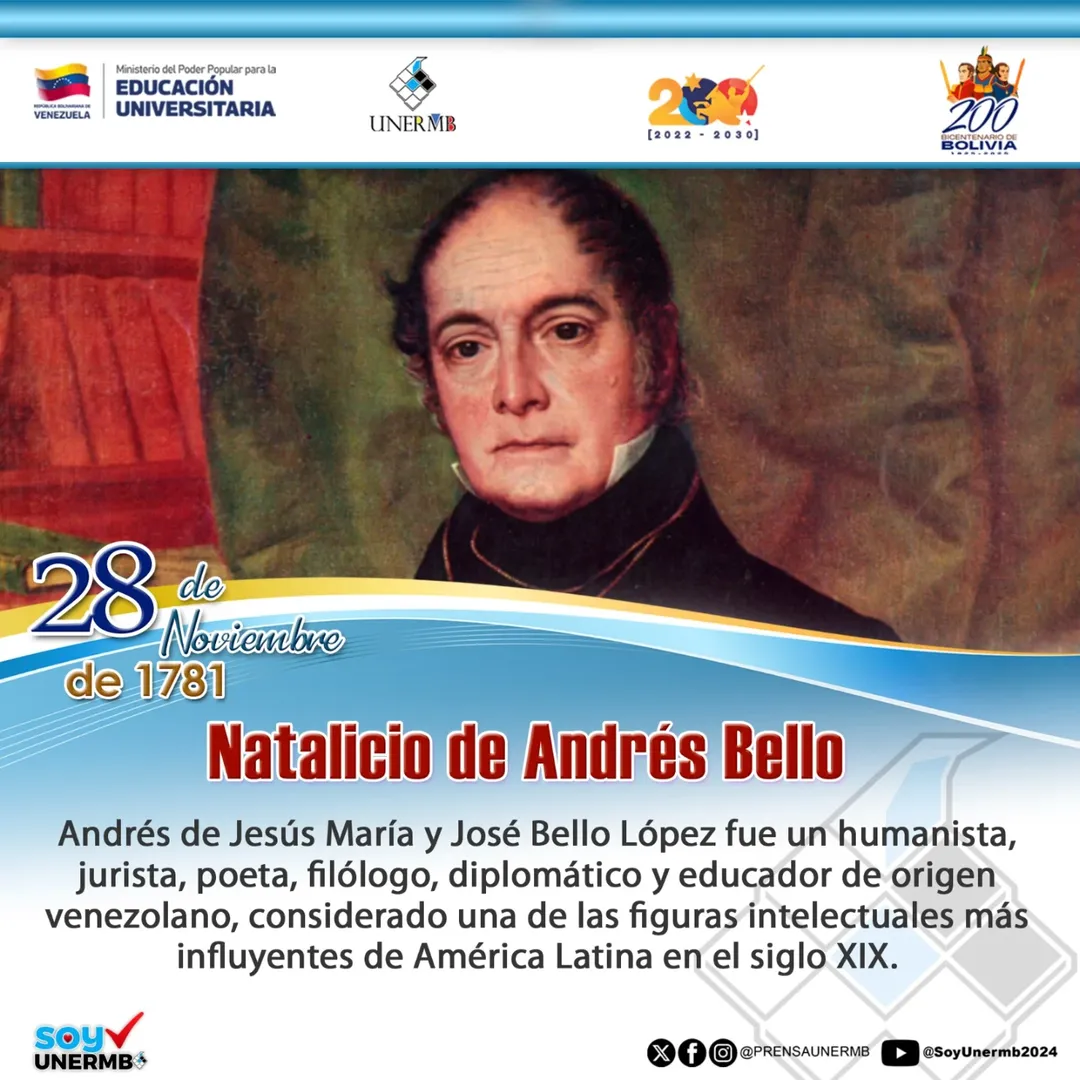 En la UNERMB, celebramos la vida y obra de Andrés Bello como un recordatorio de la importancia de la educación, el rigor académico y el compromiso cívico. Su dedicación a las letras, el derecho y la enseñanza nos inspira a seguir formando profesionales íntegros y ciudadanos críticos, capaces de transformar nuestra sociedad.