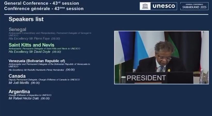 Asimismo, condenó el exterminio del pueblo palestino y la complicidad de Estados Unidos de América en esas acciones, afirmando que “cada bomba que cae sobre Gaza, como cada misil que asesina civiles en el Caribe, hiere de muerte al sistema multilateral de las Naciones Unidas y a los valores fundacionales de la UNESCO”.