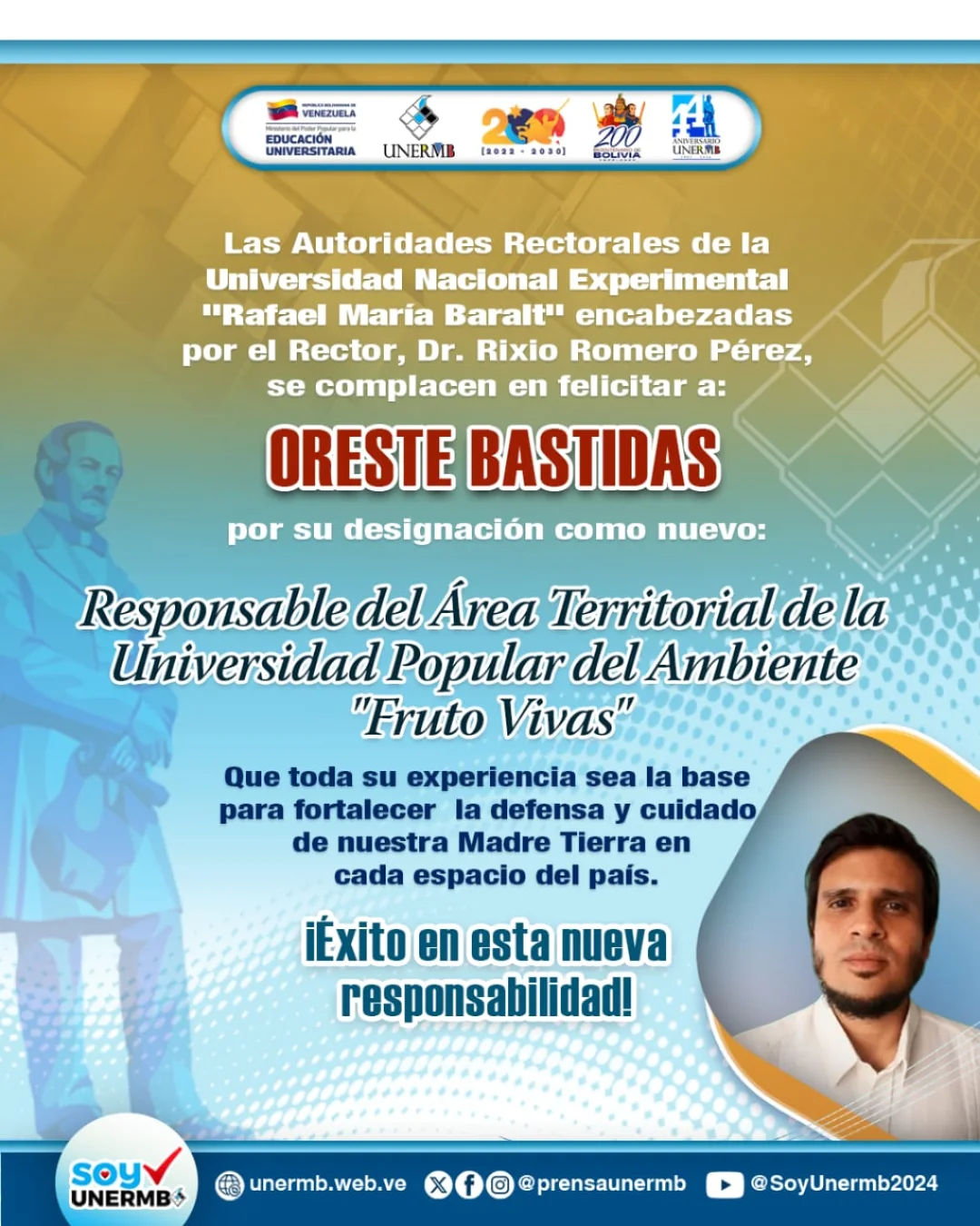 Las Autoridades Rectorales y toda la Comunidad Universitaria de la Universidad Nacional Experimental» Rafael María Baralt» ( UNERMB), felicitan a Oreste Bastidas.