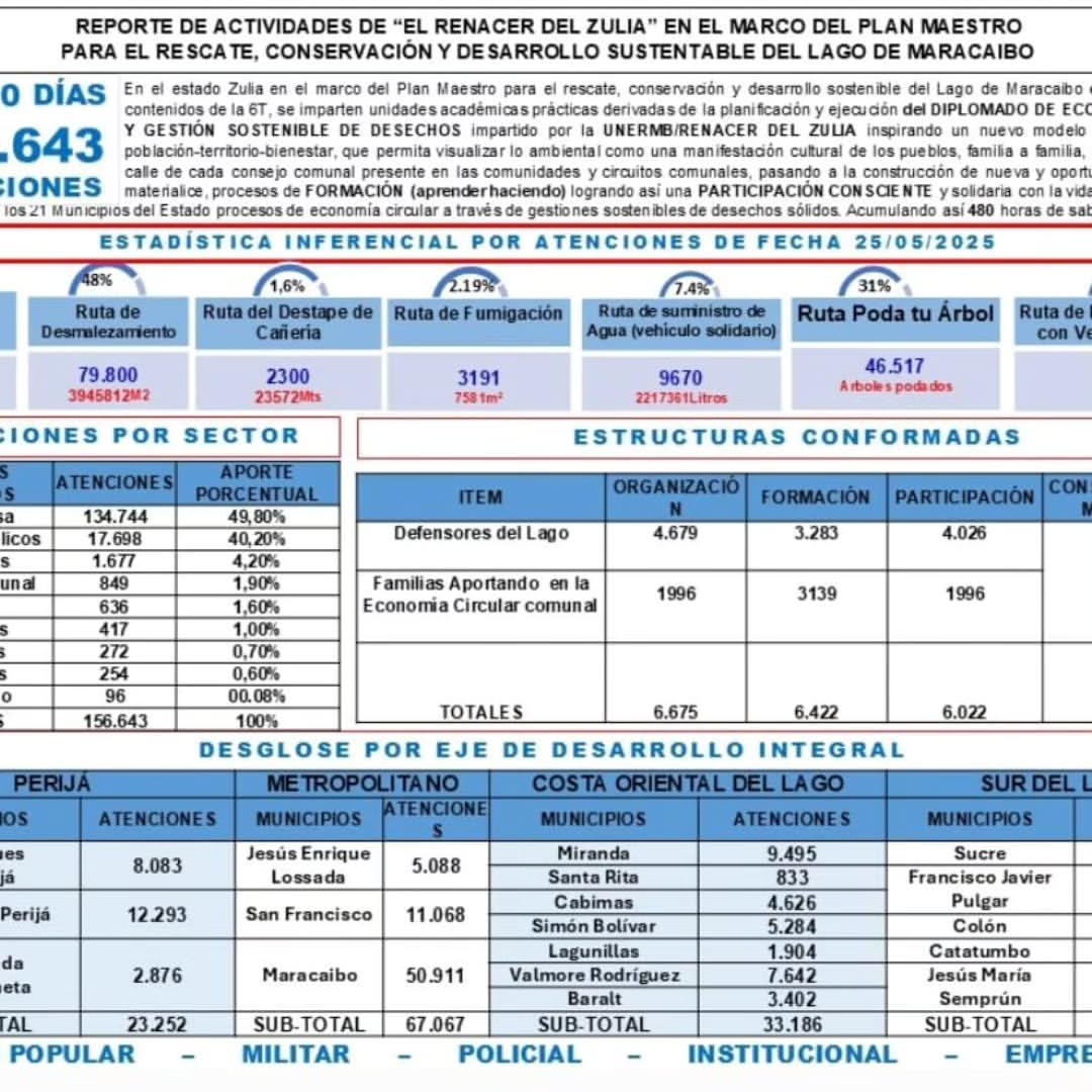 de Economía Circular y Gestión Sostenible de Desechos en todo el estado Zulia, dictado en alianza entre la Unermb y Renaser Zulia, el cual ha ejecutado más de 156 mil atenciones en diferentes sectores en al menos 90 días .