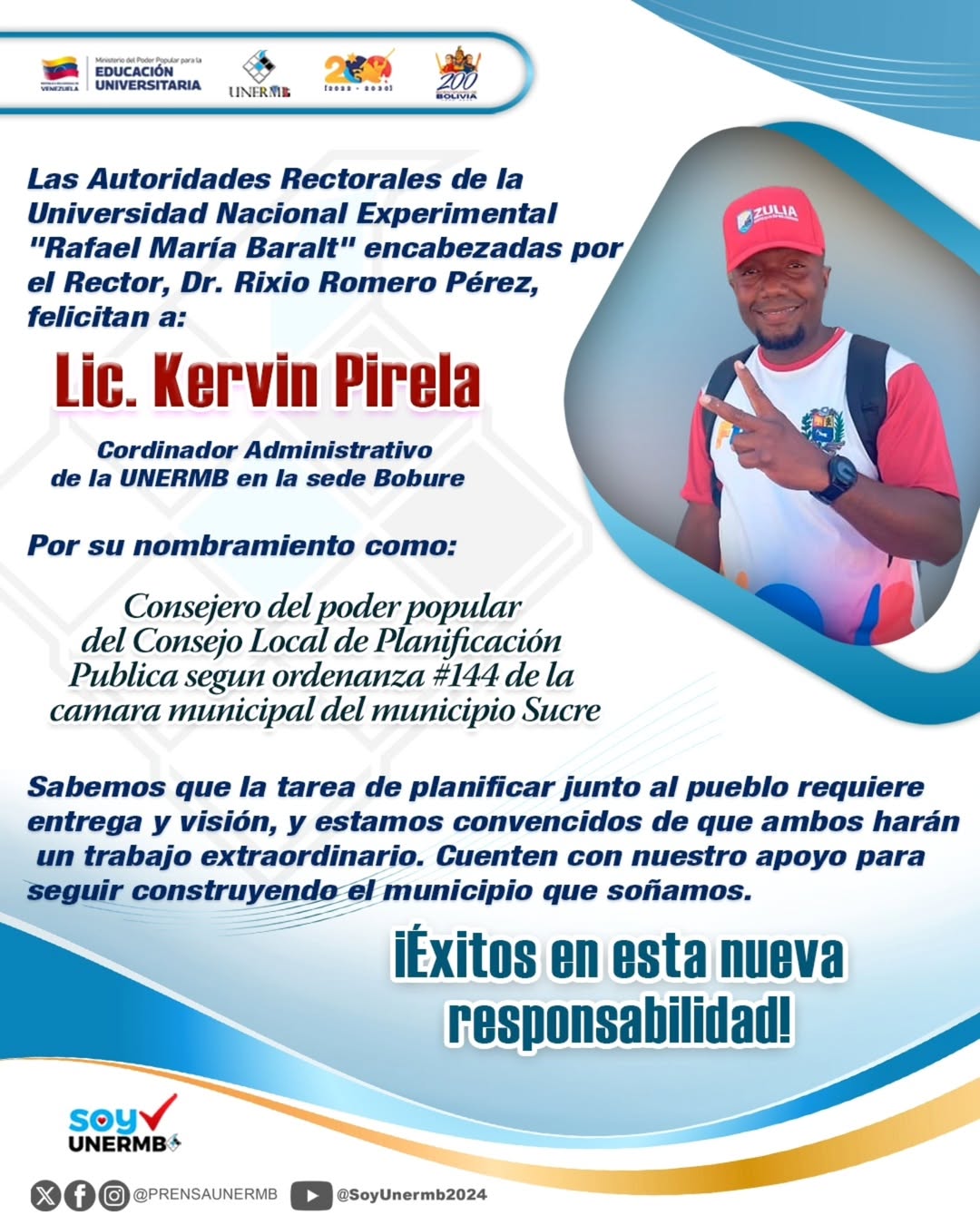 Las Autoridades Rectorales de la Universidad Nacional Experimental «Rafael María Baralt» encabezadas por el Rector, Dr. Rixio Romero Pérez, felicitan al: Lic. Kervin Pirela