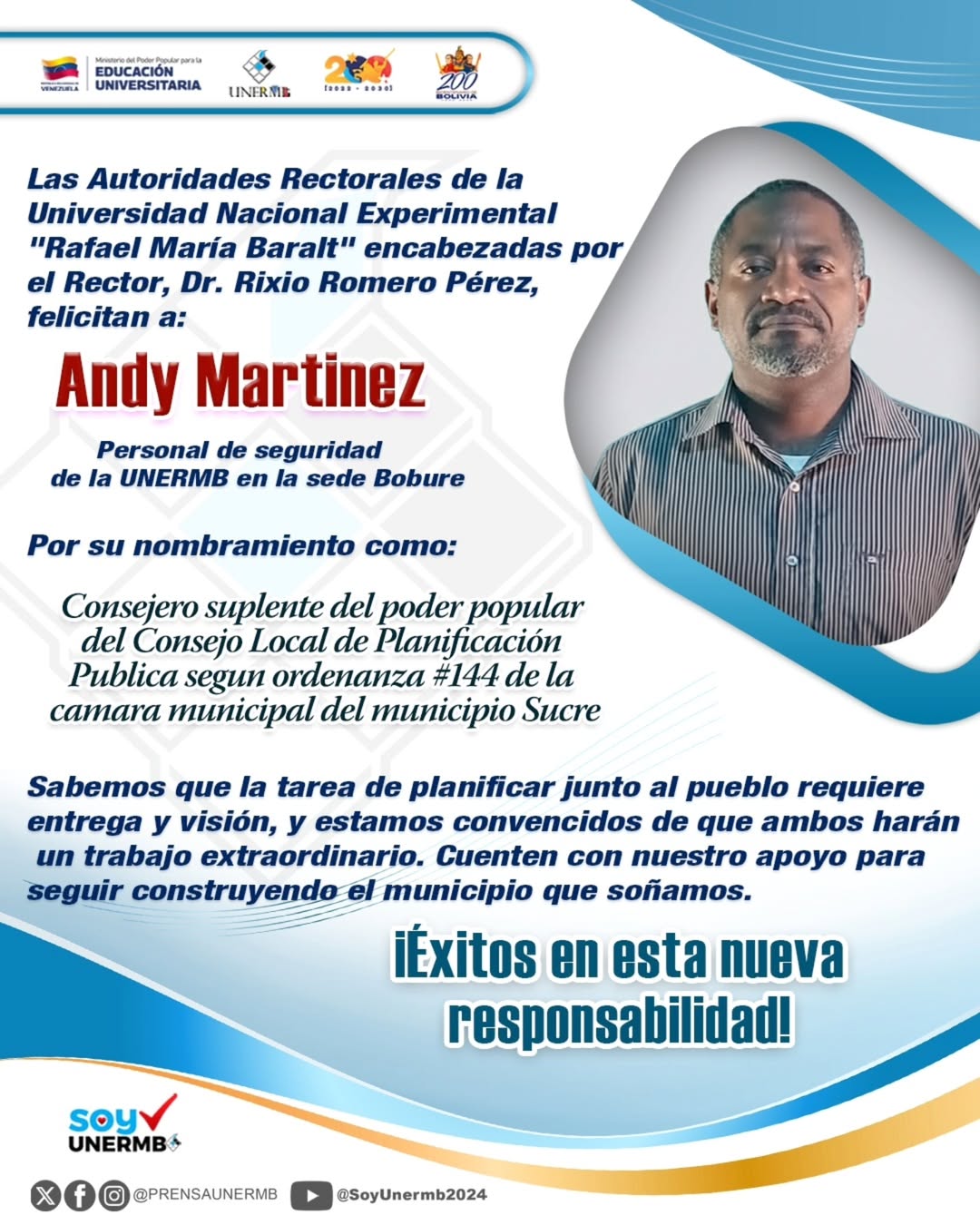 Las Autoridades Rectorales de la Universidad Nacional Experimental «Rafael María Baralt» encabezadas por el Rector, Dr. Rixio Romero Pérez, felicitan a: Andy Martinez