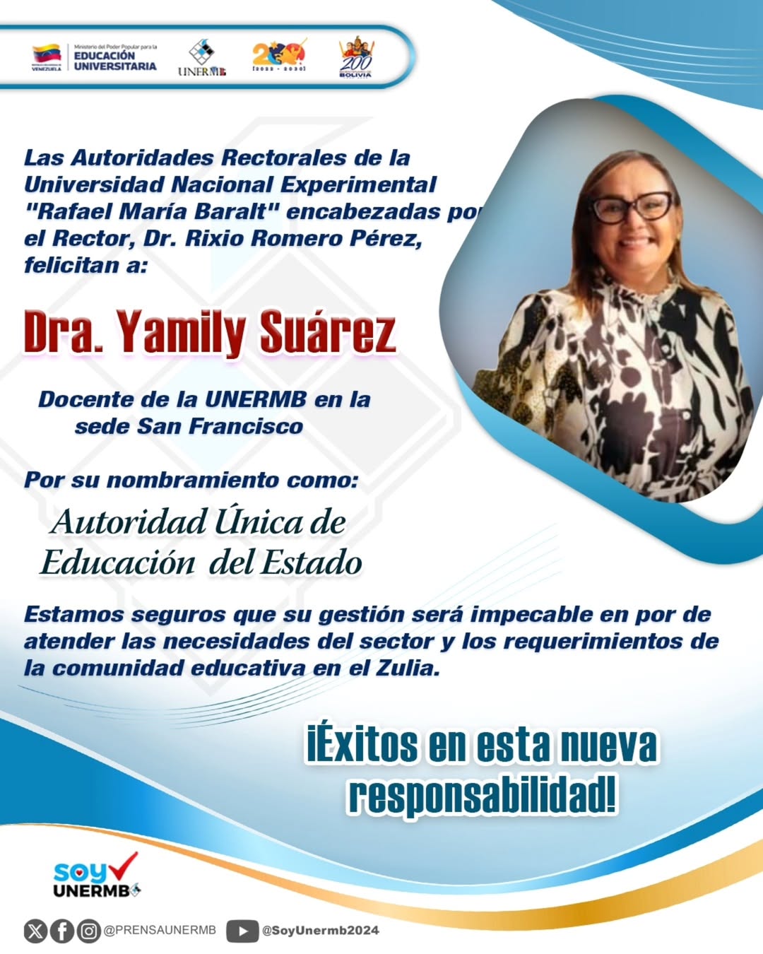 Las Autoridades Rectorales de la Universidad Nacional Experimental «Rafael María Baralt» encabezadas por el Dr. Rixio Gabriel Romero Pérez felicitan a la: Dra. Yamily Suárez