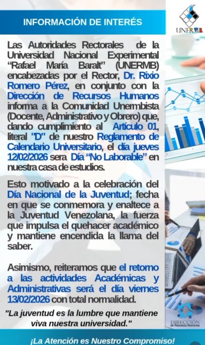 Lideradas por el Rector Dr. Rixio Romero Pérez, en conjunto con la Dirección de Recursos Humanos, informan a toda la comunidad unermbista (personal docente, administrativo y obrero) que, de acuerdo con el Artículo 1, literal «d» de nuestro Reglamento de Calendario Universitario, el día jueves 12 de febrero de 2026 ha sido declarado como Día No Laborable.