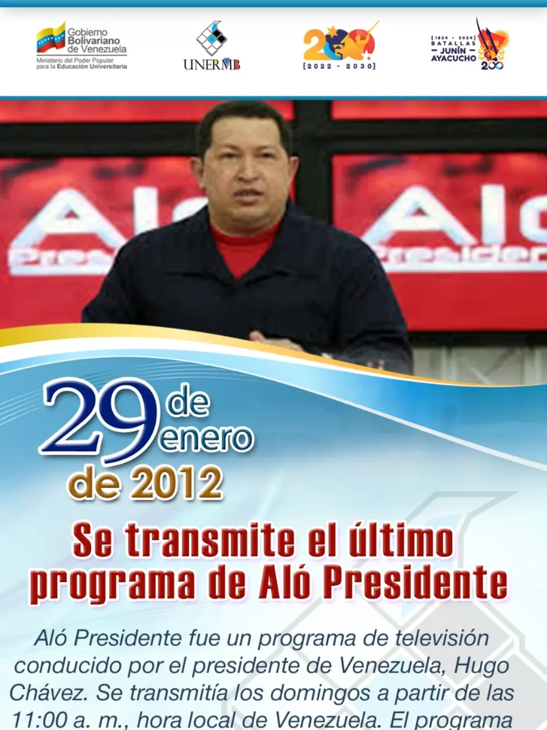 Desde la UNERMB, recordamos un momento trascendental en la historia comunicacional de nuestra Patria. Un día como hoy, el 29 de enero de 2012, se transmitió el último programa de «Aló Presidente».