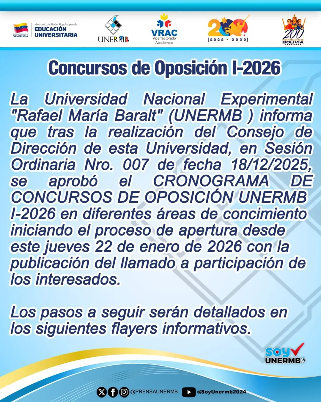 ​La Universidad Nacional Experimental «Rafael María Baralt» informa a todos los profesionales interesados que, tras la Sesión Ordinaria Nro. 007 del Consejo de Dirección, se ha aprobado oficialmente el Cronograma de Concursos de Oposición UNERMB I-2026.
